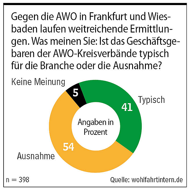 Das Geschäftsgebaren der AWO-Kreisverbände ist eine Ausnahme. Das haben 54 Prozent der Befragten geantwortet. 42 Prozent der Teilnehmer halten das Verhalten jedoch für typisch. Anlass für die Umfrage waren die weitreichenden Ermittlungen gegen die AWO-Kreisverbände Frankfurt am Main und Wiesbaden.