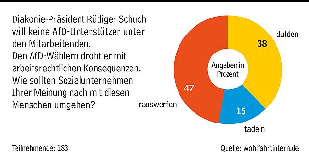 20.06.2024, 14:15 Uhr RechtsextremismusKnappe Mehrheit würde AfD-Unterstützer nicht rauswerfenWir hatten gefragt, wie Sozialunternehmen mit Mitarbeitenden umgehen sollen, die die AfD unterstützen. Hier ist Ihre Antwort. Jetzt gesamten Artikel lesen.WI.Abo bestellen oder anmelden!
