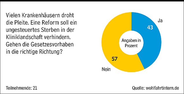 20.10.2023, 09:14 Uhr KrankenhausreformMehrheit der Branche sieht Pläne kritischGehen die Gesetzesvorhaben der geplanten Krankenhausreform in die richtige Richtung? Das hatten wir Sie gefragt. Hier ist die Antwort.Jetzt gesamten Artikel lesen.WI.Abo bestellen oder anmelden!