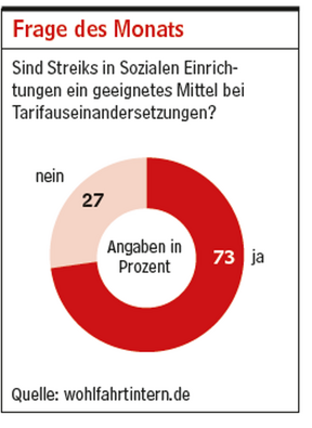 Die Wohlfahrt Intern Umfrage Juni, ob Streiks in sozialen Einrichtugen ein geeignetes Mittel bei Tarifauseinandersetzungen sind, beantwortete eine klare Mehrheit mit Ja.