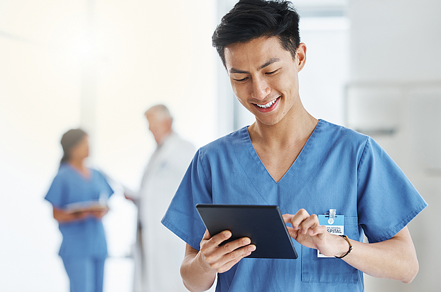 Das Robert-Bosch-Krankenhaus hat die Organisation von Fachwissen systematisiert. Das Personal kann mithilfe von Tablets jederzeit auf eine digitale Datenbank zugreifen.