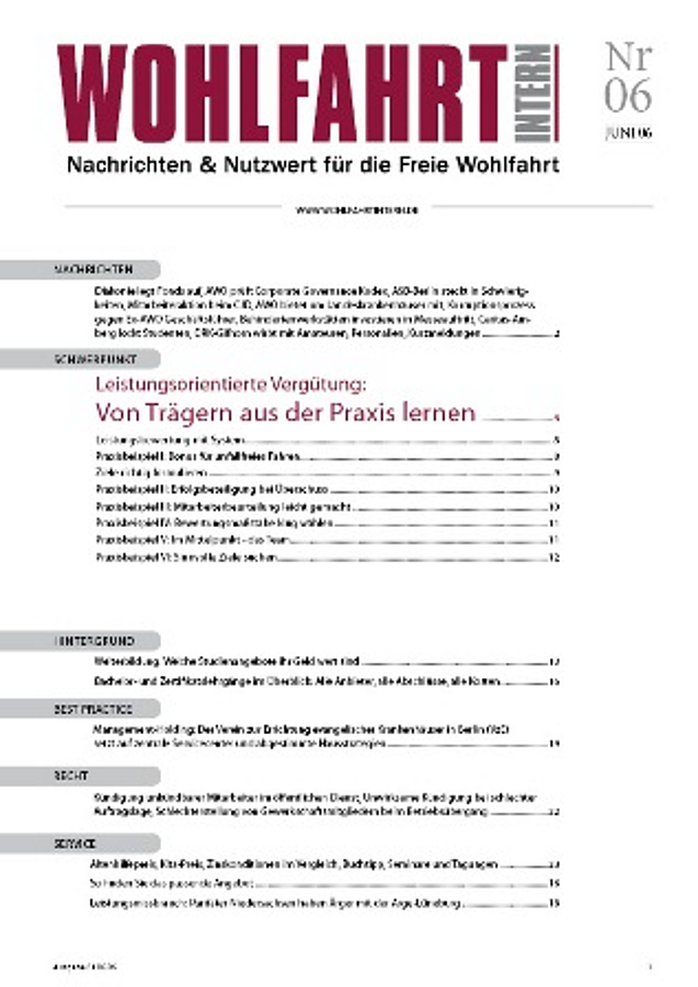 | 2 | Diakonie legt Fonds auf, AWO prüft Corporate Governance Kodex, ASB-Berlin steckt in Schwierigkeiten, Mitarbeiteraktion beim CJD, AWO bietet um Landeskrankenhäuser mit, Korruptionsprozess gegen Ex-AWO Geschäftsführer, Behindertenwerkstätten investieren in Messeauftritt, Caritas-Amberg lockt Studenten, DRK-Gifhorn wirbt mit Amateuren, Personalien, Kurzmeldungen |