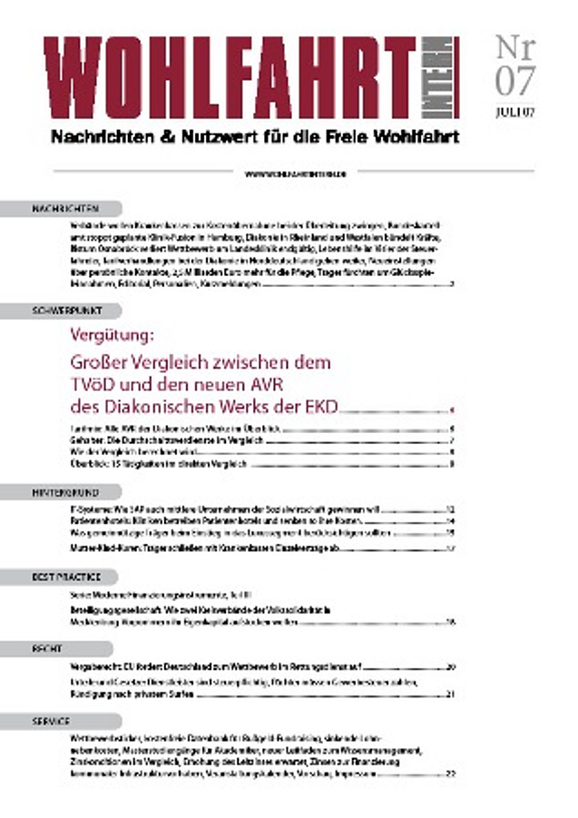 2Verbände wollen Krankenkassen zur Kostenübernahme bei der Überleitung zwingen, Bundeskartellamt stoppt geplante Klinik-Fusion in Hamburg, Diakonie in Rheinland und Westfalen bündelt Kräfte, Bistum Osnabrück verliert Wettbewerb um Landesklinik endgültig, Lebenshilfe im Visier der Steuerfahnder, Tarifverhandlungen bei der Diakonie in Norddeutschland gehen weiter, Neueinstellungen über persönliche Kontakte, 2,5 Milliarden Euro mehr für die Pflege, Träger fürchten um Glücksspieleinnahmen, Editorial, Personalien, Kurzmeldungen