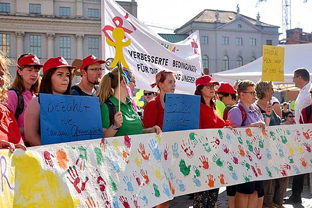 Brandenburger Kita-Träger haben vor dem Landtag mit Eltern, Kindern und Erziehern demonstriert. Kita-Träger Fröbel, der AWO Landesverband, das DRK sowie Caritas und Diakonie fordern mehr Geld für längere Betreuungszeiten.